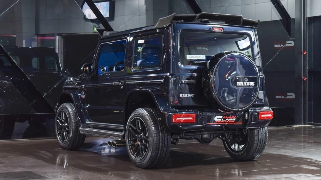Над лобовым стеклом появились две дополнительные светодиодные люстры. К задней части крыши прикрепили большое карбоновое крыло. На корме — новая оптика и крышка запасного колеса с логотипом Brabus. Дополняют образ большие боковые подножки и расширенные колесные арки, под которыми установлены новые черные колесные диски.
