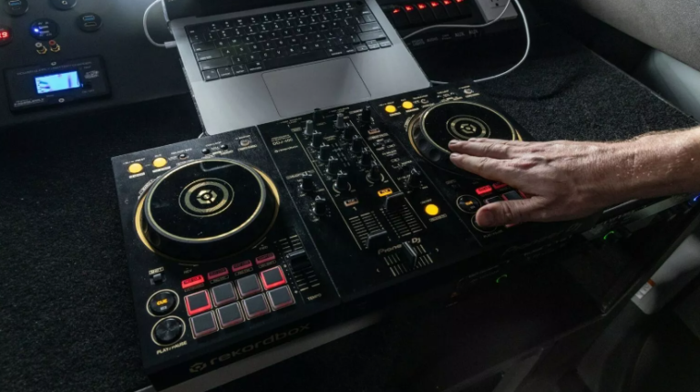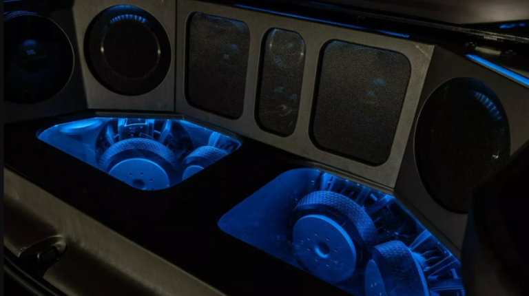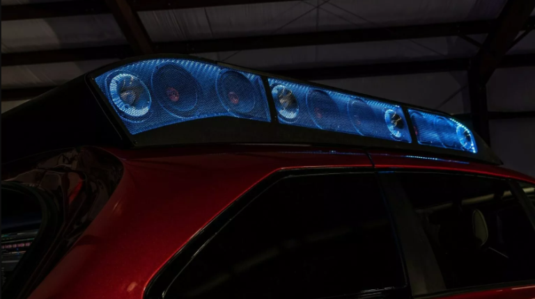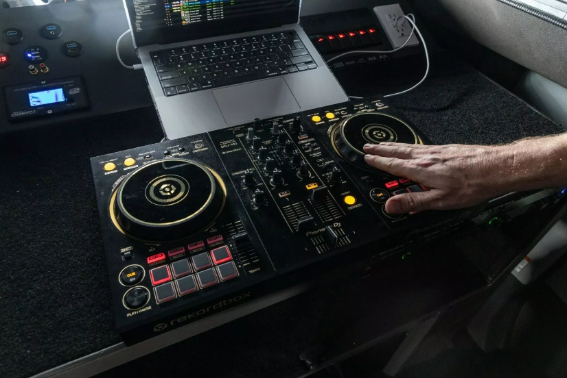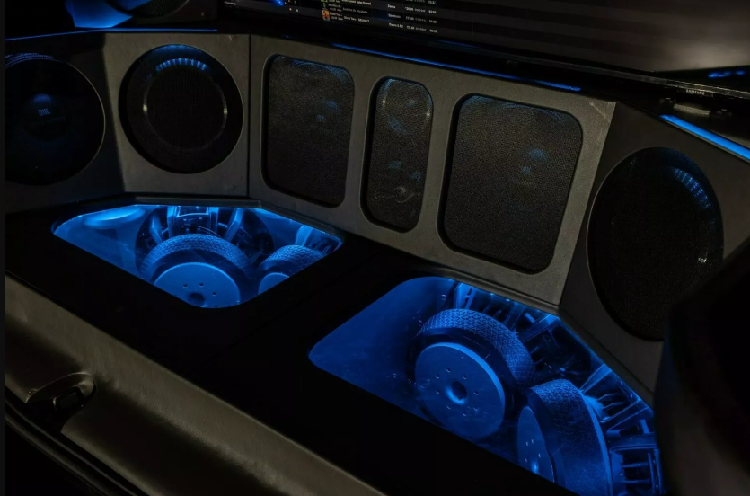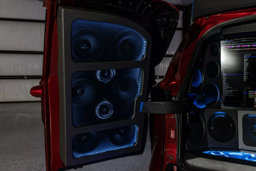 Помимо невероятной аудиосистемы автомобилю увеличили дорожный просвет, установили 22-дюймовые колесные диски, а традиционную заднюю дверь заменили на распашную. Крыша автомобиля выдвижная и открывается. Она скрывает полноценный диджейский пульт с двумя цифровыми проигрывателями.