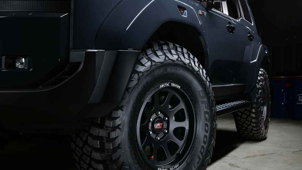 Land Cruiser Prado от Arctic Trucks выглядит довольно скромно, но прочно. Специалисты установили на авто новые массивные бамперы и расширители крыльев, алюминиевые подножки и скрытый фаркоп. Также есть брызговики и 17-дюймовые кованые легкосплавные колесные диски с матово-черной отделкой, обутые в 37-дюймовые шины BFGoodrich. Эти шины не только обеспечивают хорошую проходимость, а и придают Prado агрессивный и мощный вид.