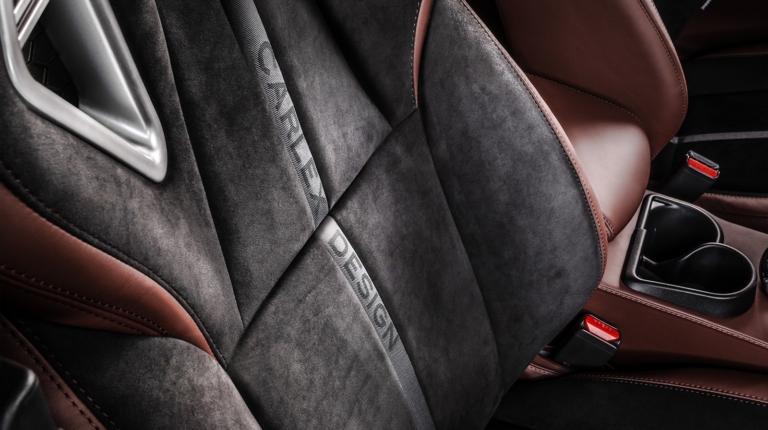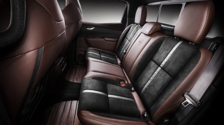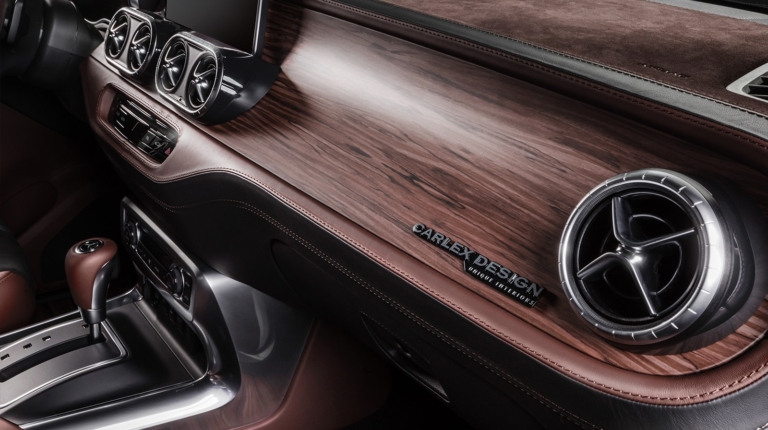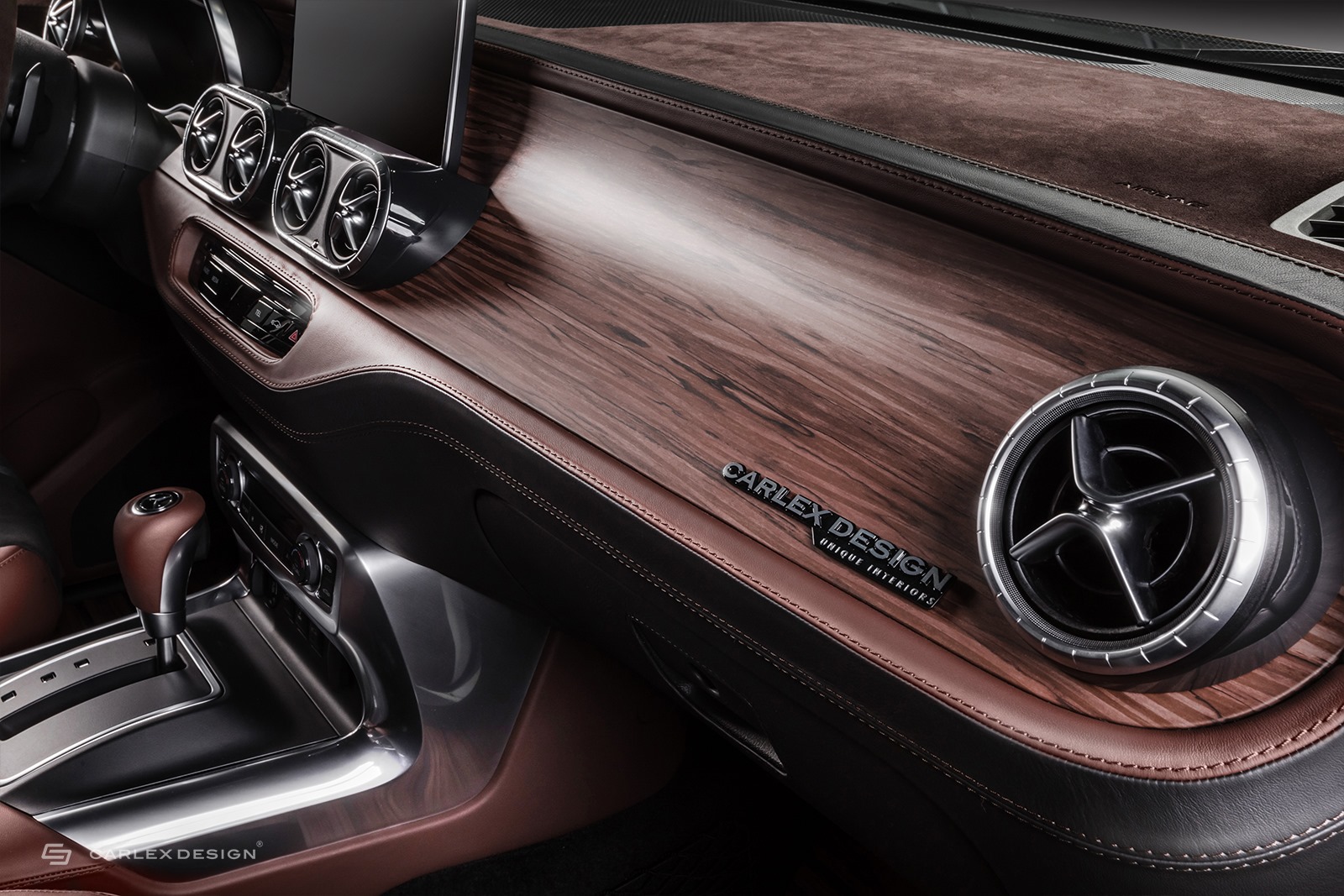 Основная же часть доработок коснулась салона X-Class. После проведенных модернизаций он стал абсолютно не похож на оригинал. В частности тюнер применил деревянные акценты на приборной панели и руле. Также из деревянных планок выполнены напольные коврики. Сидения, центральная консоль, дверные карты, подголовники, ручной тормоз и рычаг переключения передач отделаны коричневой кожей, которая дополнена элементами из алькантары. Дополняют изысканный образ логотипы тюнера.