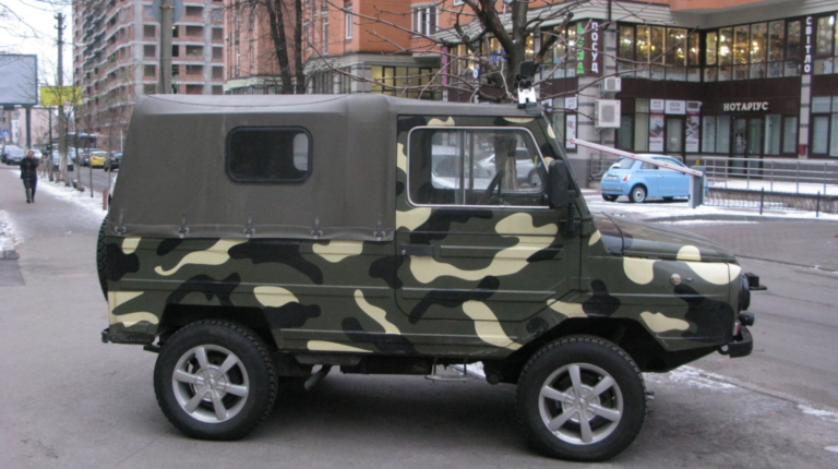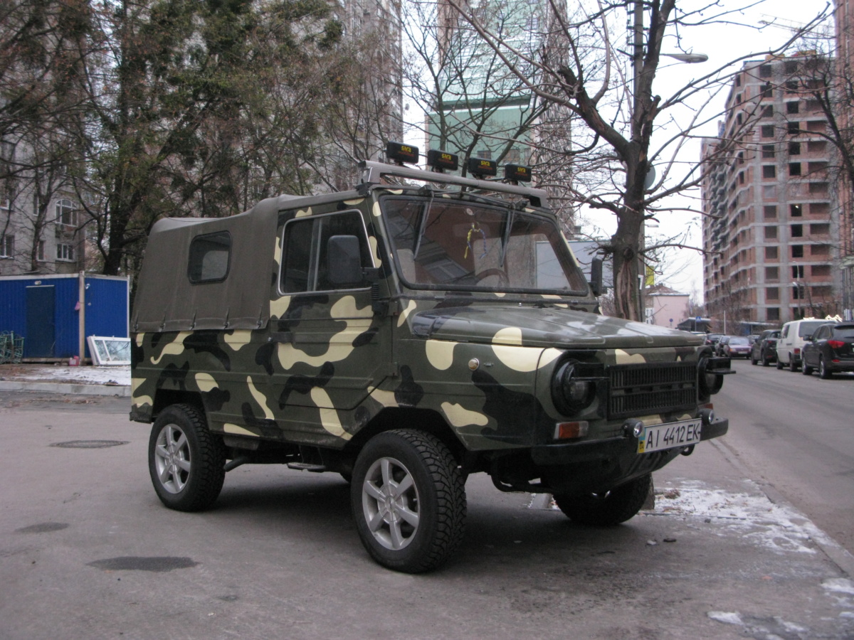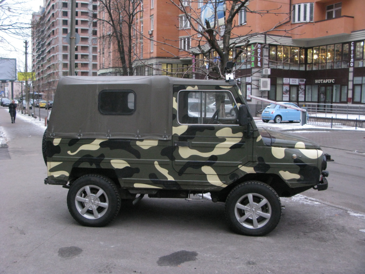 Этот ЛУАЗ-1302 удалось сфотографировать на улицах Киева. Машина привлекла внимание стильным тюнингом. Во-первых, это эффектный камуфлированный окрас и светомаскировочные фары – то что нужно для охотников или для военных. Во-вторых, стильные легкосплавные диски колес. В-третьих, мощная люстра на крыше. И еще один эффектный элемент – наклейка на заднем окошке с цифрой «300». Такой не догнать.