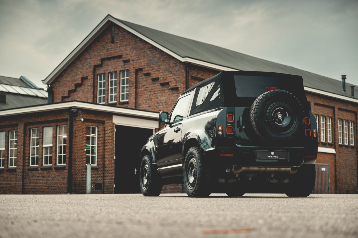 Кабриолет сохранил классический стиль и характер Defender 90. Кузов кабриолета окрасили в красивый зеленый оттенок, дополненный черными вставками, в частности, мягкий тканевый верх ручной работы. Еще одно отличие от базовой модели — изготовленные на заказ боковые вентиляционные отверстия с названием компании прямо перед боковыми дверями. Стандартные колесные диски заменили стальными штампованными от Heritage Customs черного цвета.