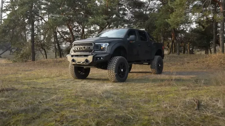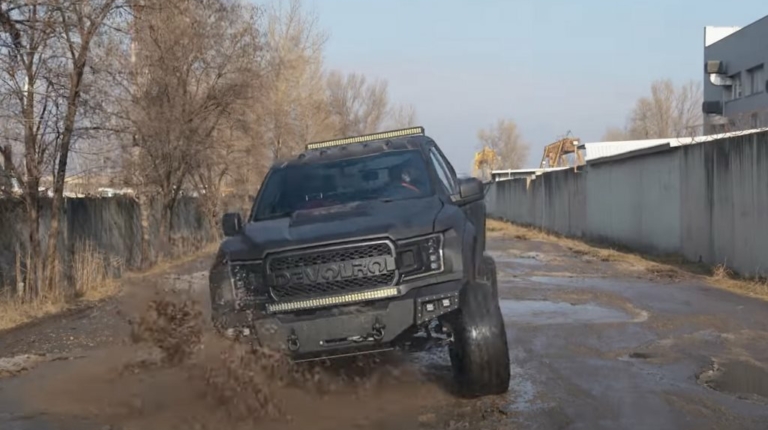 Как выяснилось, руку к этому проекту приложила украинская мастерская Werewolf 4×4. Специалисты взяли за основу не стандартный пикап, а тюнингованную версию от американского ателье Devolro. Ему увеличили на 19 см дорожный просвет, установив портальные мосты. Также интегрировали усиленные бамперы, новые фары и лебедку. Колеса обули во внедорожные шины.