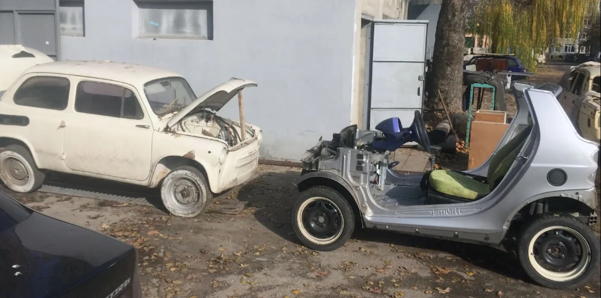 В качестве донора для ЗАЗ-965А выбрали всем хорошо известный Smart. Машину для этой цели взяли уже частично разобранную, на болгарских номерах.