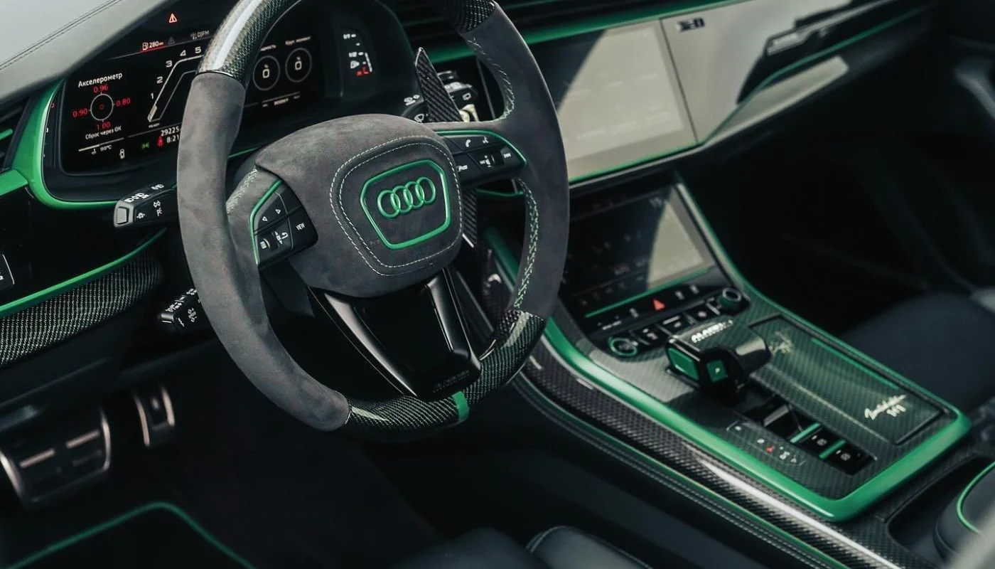 Все изменения сконцентрированы в салоне кроссовера. Тюнеры отделали его черной кожей и алькантарой, а в качестве акцентов использовали карбон с контрастными зелеными вставками и прострочку ярко-зелеными нитками. Также добавили контурную подсветку.