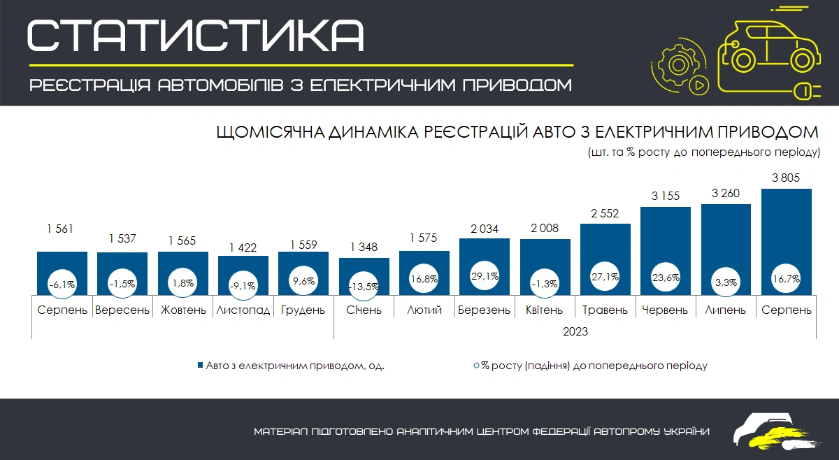 Самым результативным оказался последний месяц лета. Как сообщила Федерация автопрома, в августе свои первые украинские номерные знаки получили 3805 электромобилей. Это на 16,7% больше, чем в предыдущем июле и в 2,4 раза больше, чем годом ранее.