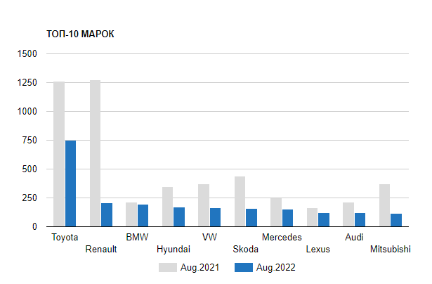Несмотря на то, что спрос на новые Toyota был по-прежнему высоким и марка смогла оказаться на вершине рейтинга, продажи этих машин в сравнении с прошлым годом упали на 40%. А вот по сравнению с июлем этого года спрос на авто японской марки вырос на 26%. Лидером в личном зачете стал кроссовер Toyota RAW4. На его счету 168 регистраций.