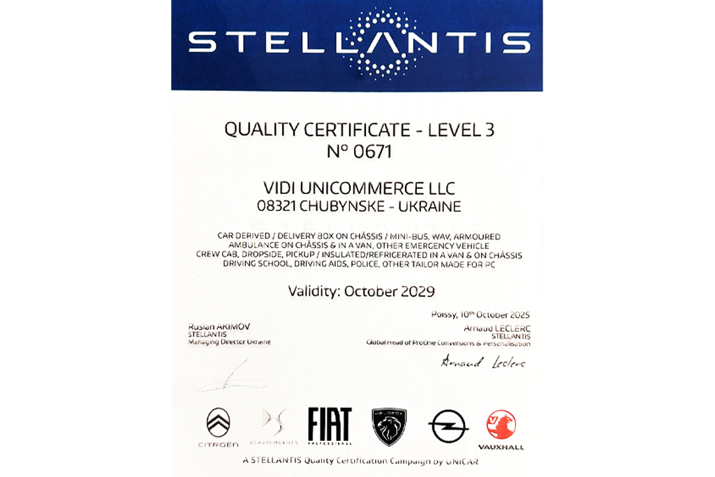 Крім того, концерн Stellantis прагне забезпечити клієнтам максимально якісну продукцію, на яку можна покластись в роботі. Саме для цього була запроваджена процедура сертифікації Stellantis для компаній-партнерів з переобладнання, що працюють з автомобілями концерну. І нещодавно кількість таких компаній-партнерів в Україні знову зросла – адже міжнародний сертифікат якості від Stellantis отримала компанія «ВІДІ Юнікомерс»!