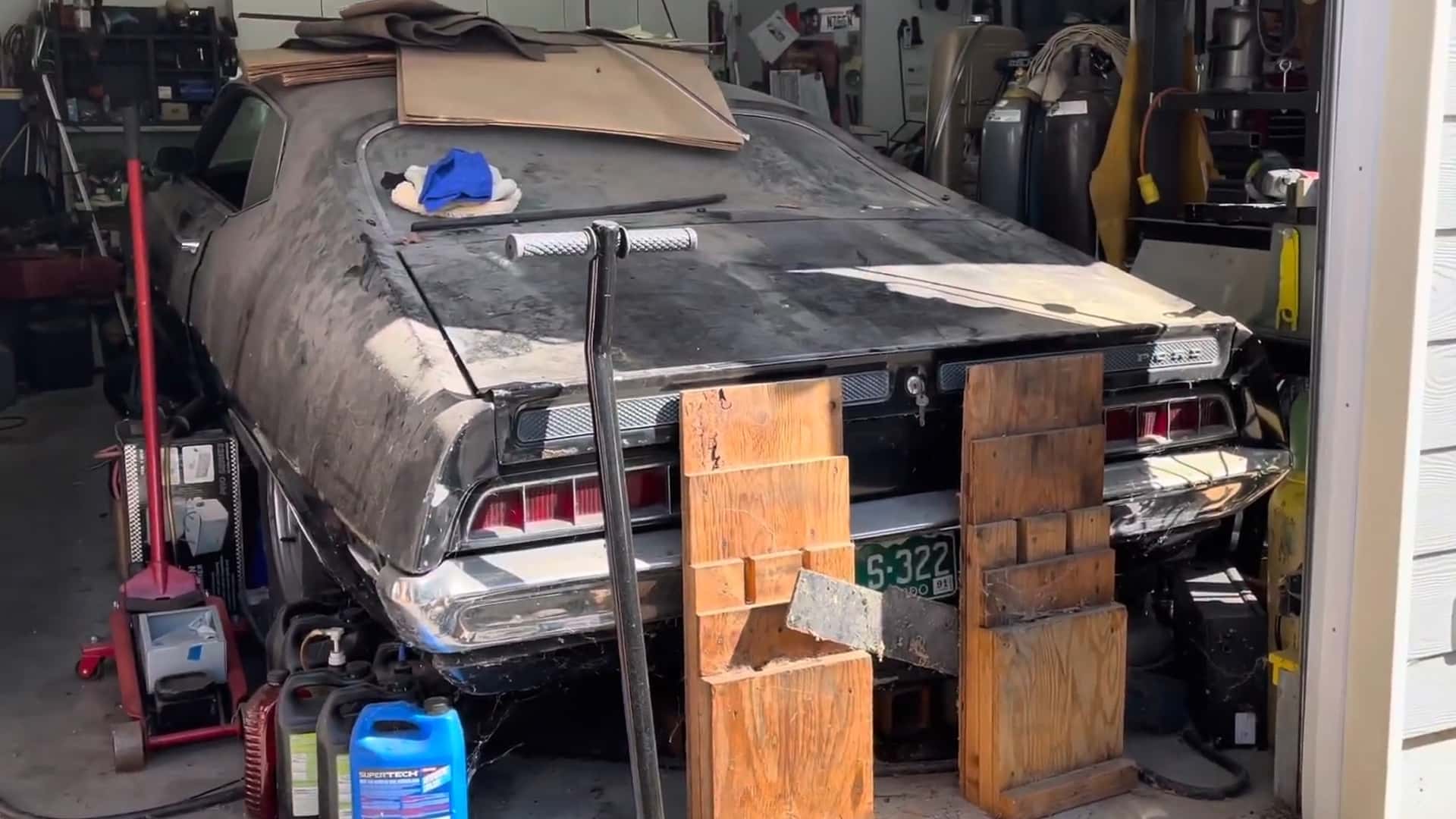 Все снятые с мотора детали до сих пор лежат в багажнике. В салоне разбросаны разные мелочи, а крылья полностью сняты. Несмотря на годы, в целом маслкар выглядит довольно прочным, хотя в некоторых местах видна ржавчина.