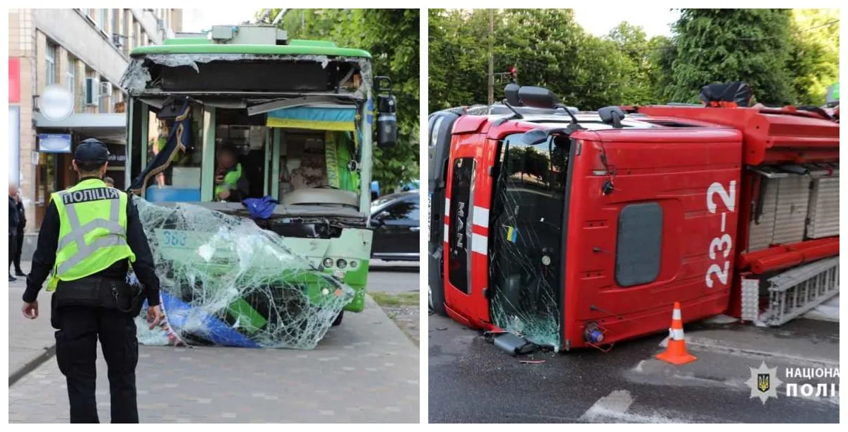 На пересечении бульвара Шевченко и улицы Небесной Сотни в Черкассах произошла масштабная авария – столкнулись троллейбус и пожарная машина. Еще повреждено пять легковых автомобилей, которые были припаркованы у тротуара.