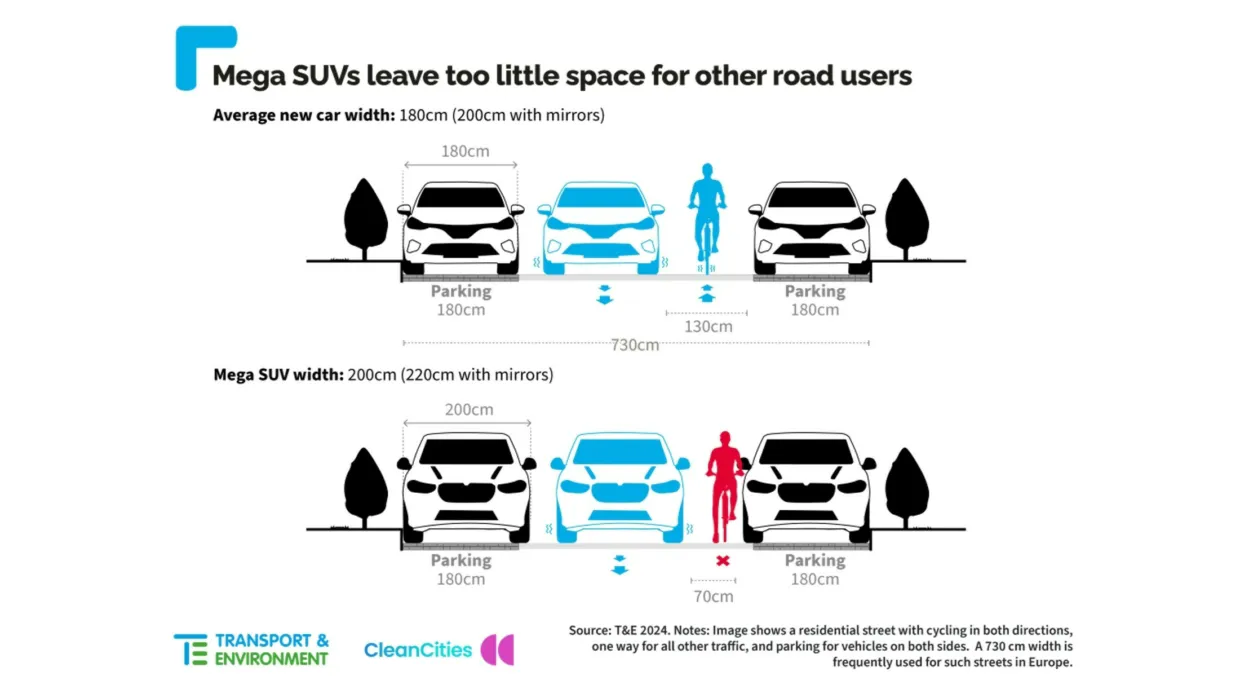 Согласно новому исследованию Transport & Environment (T&E), средняя ширина новых автомобилей в ЕС в настоящее время превысила 1800 мм. Начиная с 2001 года автомобили раздавались в ширину в среднем на 5 мм в год и на данный момент достигли 2000 мм и даже превысили эту цифру. Например, ширина Mercedes-Benz GLS составляет 2030 мм, Volvo EX 90 — 2039 мм, Range Rover/Range Rover Sport — 2047 мм.