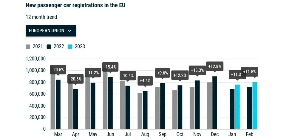 В совокупности, в течение января-февраля 2023 года в ЕС зарегистрировано 1,6 млн новых автомобилей. По сравнению с тем же периодом 2022 года их численность возросла на 11,4%. Наибольший вклад в это внесла Испания, где продажи выросли на 32,1%. На трех остальных крупнейших рынках ЕС результаты были следующими: в Италия — на 18,2%, во Франции — на 9,1%, в Германии — на 0,2%.