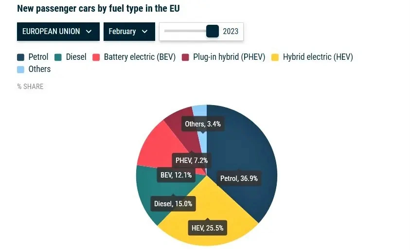 Спрос на дизельные модели в феврале 2023 года продолжил падать. Несмотря на прирост в отдельных странах, так Польша (+18,9%), Чехия (+12,4%) и Италия (+2,2%) падение продаж составило 8,4%.