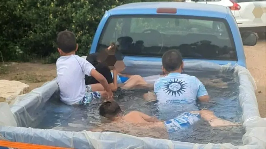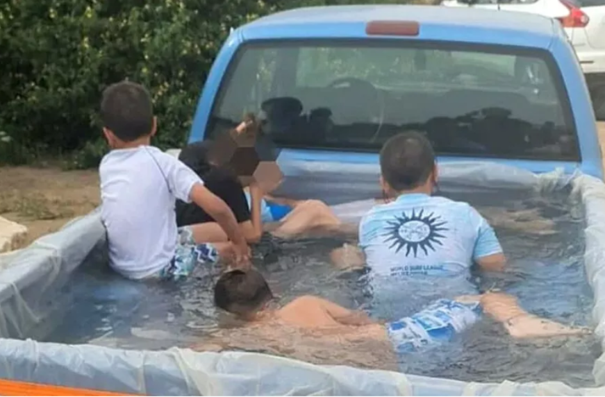 В израильском регионе Шарон владелец пикапа нашел спасение от палящего летнего солнца. Он превратил грузовую платформу автомобиля в бассейн.