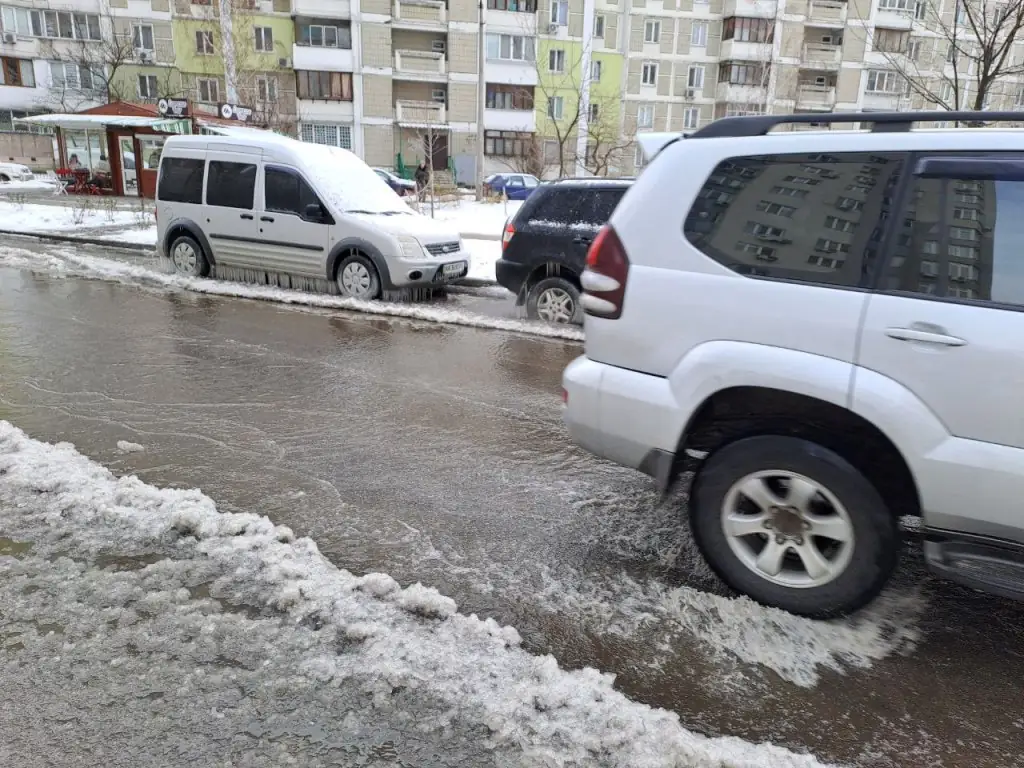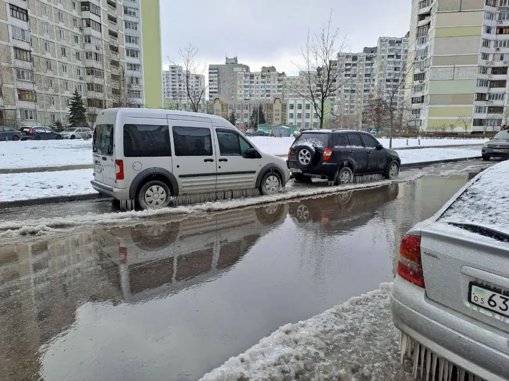 Как сообщают жители Троещины, поток воды не прекращается с ночи. Межквартальные дороги затоплены полностью. Так как температура воздуха на данный момент -4°C, то вода быстро замерзает, превращая авто в сосульки.