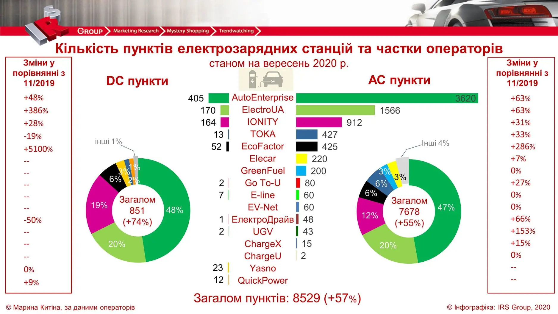 Самую широкую сеть заправочных станций предоставляет компания AutoEnterprise. Она насчитывает 3620 пунктов переменного тока (AC) и 405 постоянного (DC). Станции данной компании расположены во многих городах Украины, в том числе в Киеве, Харькове и Одессе. На втором месте в рейтинге находится компания ElectroUA, которая предлагает владельцам электрокаров 1566 AC и 170 DC пунктов. Они расположены в городах Киев, Днепр, Львов, Ужгород и Тернополь. Замыкает тройку лидеров IONITY с показателем в 912 (AC) и 164 (DC) станции.