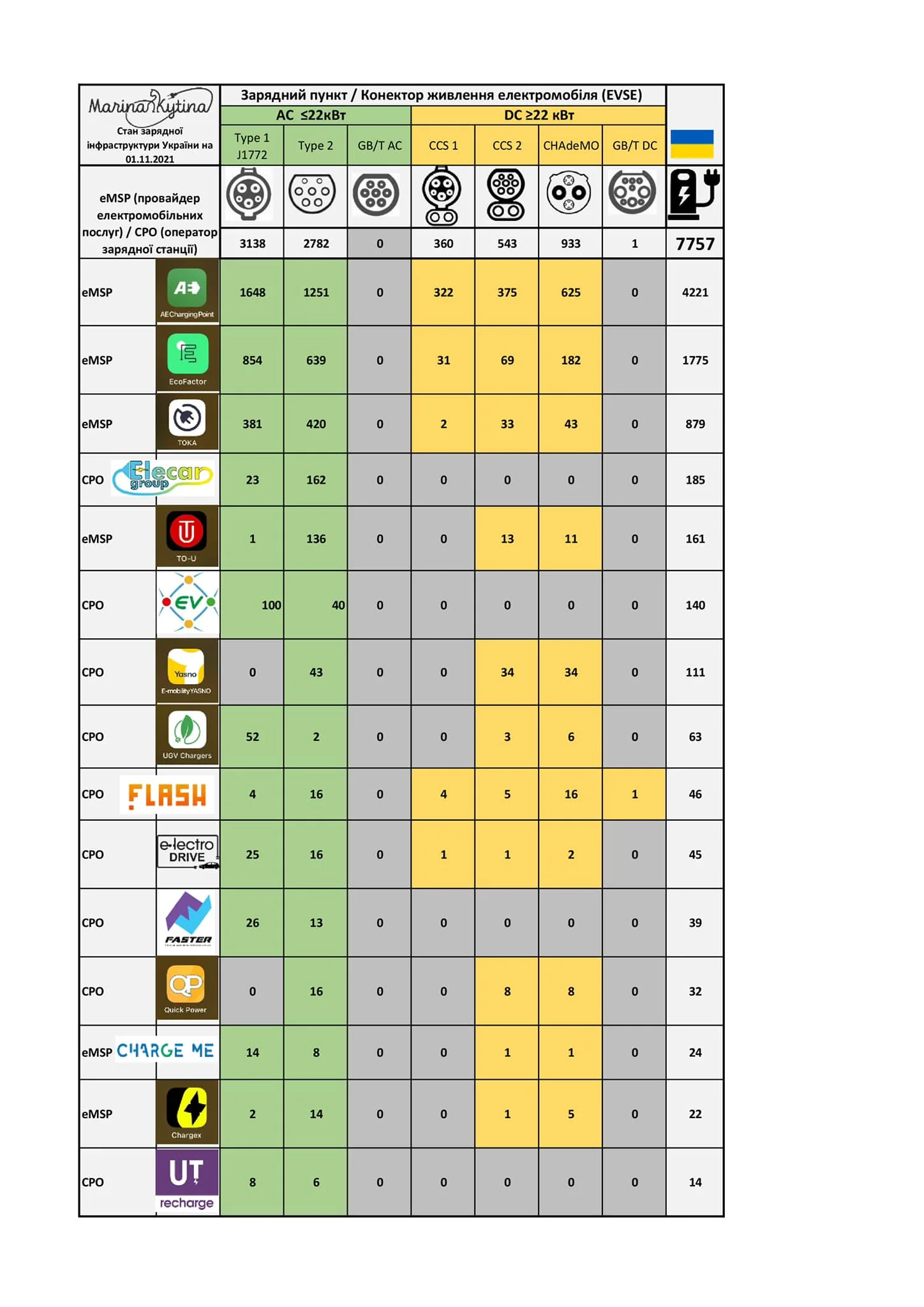 По данным эксперта рынка электромобилей Марины Китиной, по состоянию на 1 ноября 2021 года на территории Украины установлено 3244 зарядных станций. Учитывая, что в них по несколько зарядных портов, то непосредственно точек зарядки насчитывается 7757 единиц. Из них «медленных» AC ≤22кВт (Type 1, Type 2, J 1772) – 5920 единиц, и «быстрых» DC ≥22 кВт (CCS 1, CCS 2, CHAdeMO, GB\T) – 1834 единицы.
