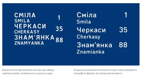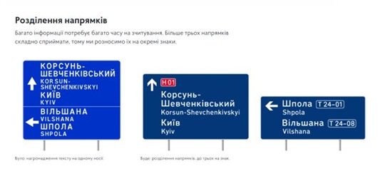 Госагентство предоставило для публичного рассмотрения новые варианты дорожных навигационных знаков. Первое изменение, которое сразу же бросается в глаза – это изменённый шрифт на указательных знаках. Раннее в названиях использовали исключительно заглавные буквы. Теперь же предлагается использовать заглавные буквы в начале слова, а все последующие сделать строчными. Подобная практика уже давно используется в большинстве европейских стран. Научно доказано, расстояние считывания и понимание текста на 10-15% больше, в отличие от текста, состоящего из исключительно прописных букв, имеющих вид набора из прямоугольников, сливающихся в сплошную кашу. А чтобы не ломать визуальную привычку, предлагается новый шрифт Road UA, имеющий некоторое сходство с доныне используемым шрифтом ГОСТ.