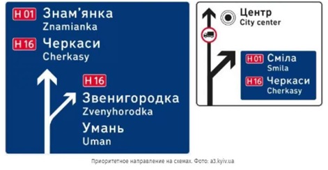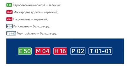 Многие водители ориентируются по номерам трасс, к тому же практика кодирования цветами различных трасс не нова. Поэтому «Укравтодор» предлагает применять цвет по приоритетам дорог: европейские маршруты – зелёный, международные и национальные – красный, региональные и территориальные останутся «неподцвеченными». Кроме этого, номера дорог будут обязательно дублироваться в показчиках расстояний и направлений. Если в том же направлении есть важный город, расположенный на другой трассе, на знак нанесут линию-разделитель, а номер другой трассы разместят после названия. В целях упрощения ориентирования в схемах приоритетное направление будет выделятся толщиной и размером стрелок.
