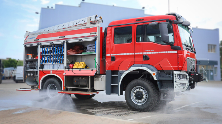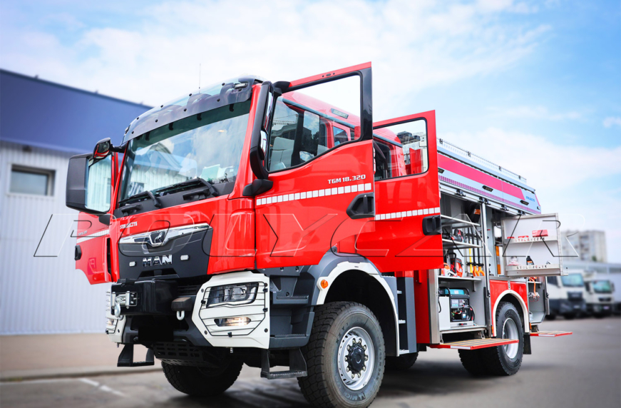 В основу машины положили полноприводное шасси MAN TGM 18.320 (4х4), то есть рассчитанное на полную массу 18 т и оснащенное 320-сильным двигателем. Двухрядная кабина имеет 6 мест для боевого расчета. Четыре задних сиденья оснащены креплениями под кислородные баллоны.
