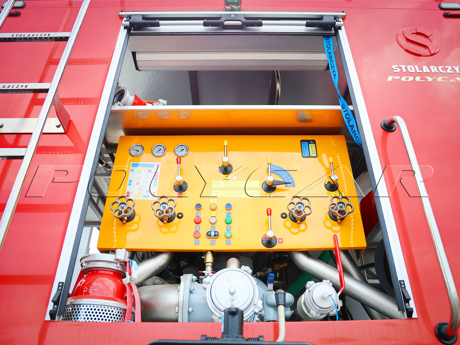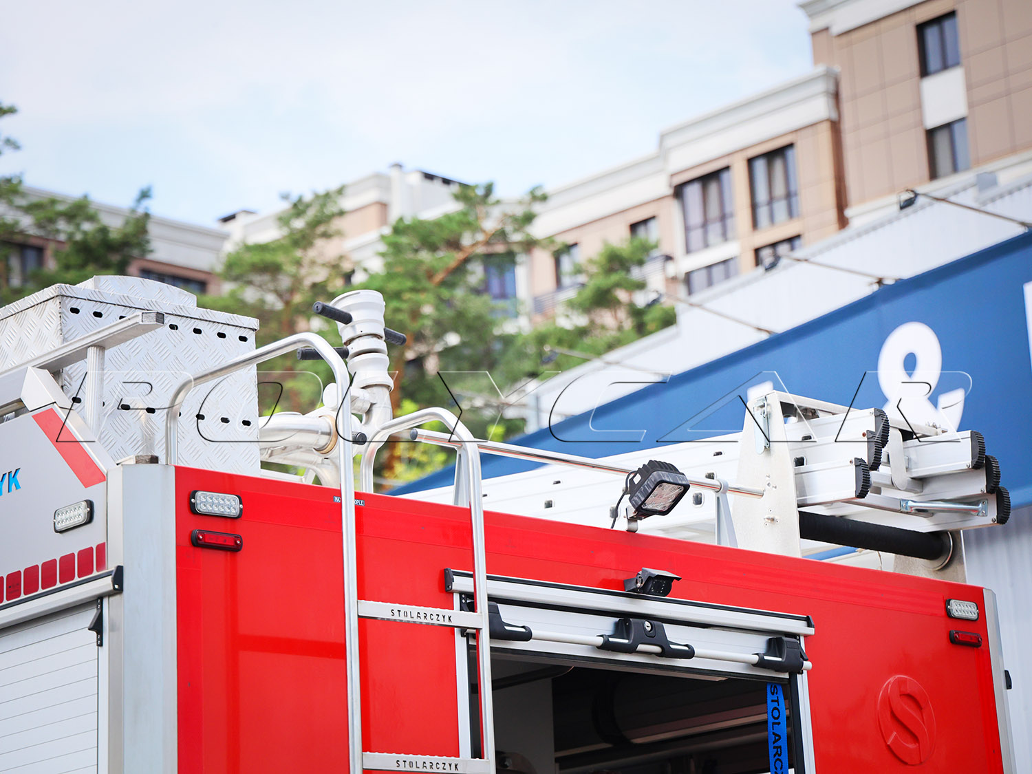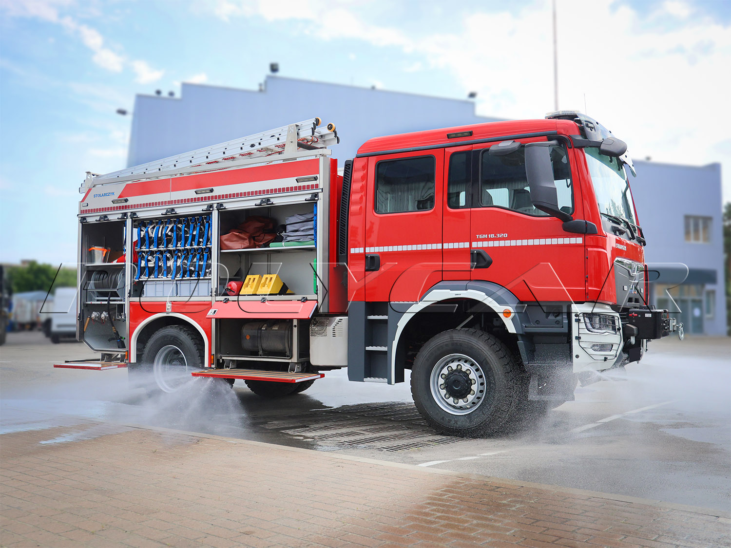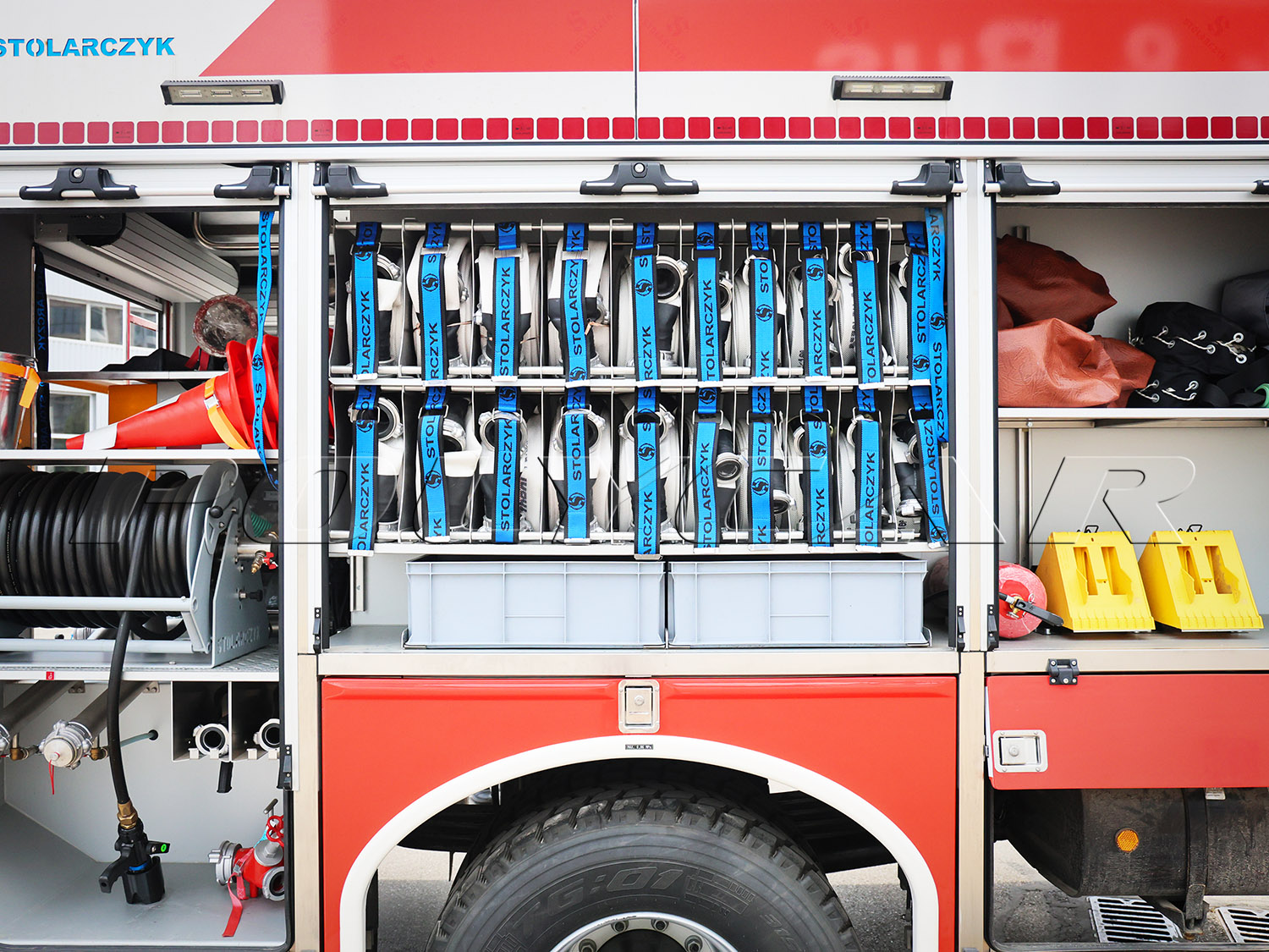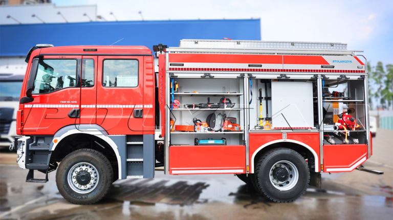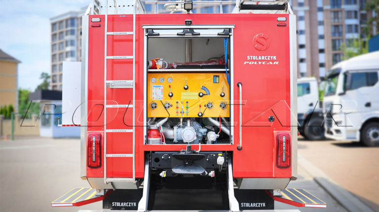 Кузовную надстройку в сборе, включая необходимое оборудование, поставил польский производитель техники для огнеборцев – компания Stolarczyk. Здесь расположен 4300-литровый резервуар для воды, 10% объема которого отведено под пенообразователь. Применяется пожарный насос S30HP производительностью 3000 л/мин при давлении 8 бар и 400 л/мин при 40 бар.