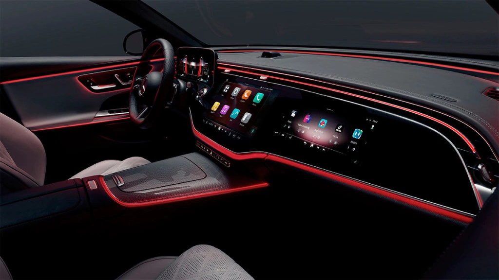 Компания Mercedes-Benz опубликовала фото салона E-Class нового поколения, точнее подсвеченной передней панели. Именно там и сосредоточенно все самое интересное. Как видно на снимках, во всю ширину, от двери до двери, расположились три цветных дисплея: приборная панель, «мультимедийка» и пассажирский экран.