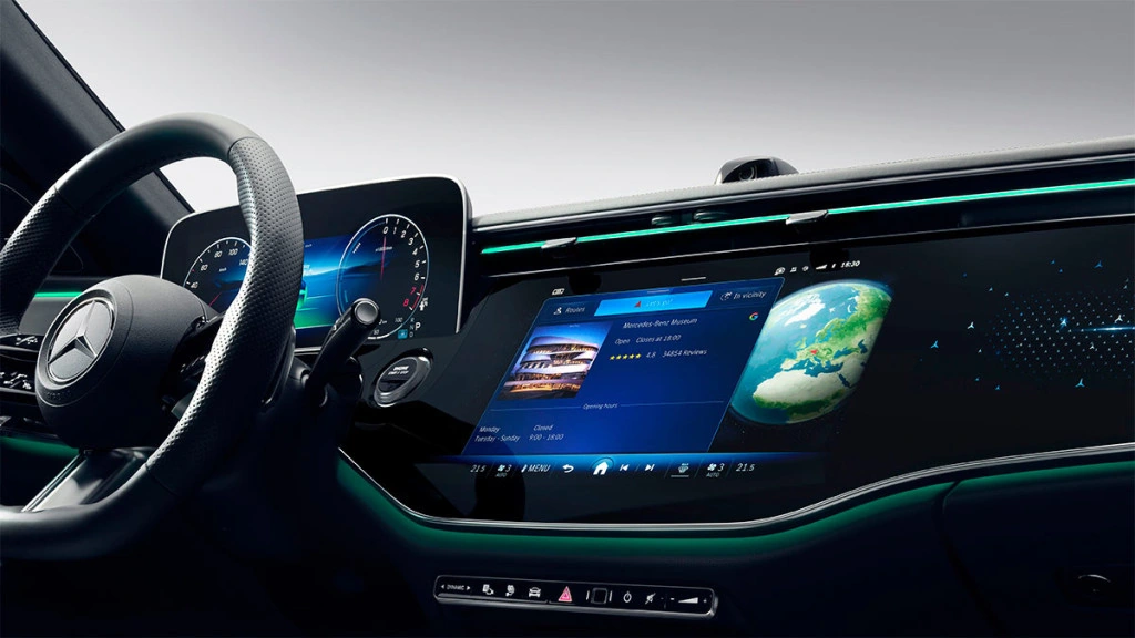 Установлены они таким образом, чтобы в поле зрения водителя не попадало то, что видят пассажиры. А им новому Mercedes-Benz E-Class есть что предложить: видеоигры, онлайн видео- и аудиосервисы, видеоконференции, в частности Zoom, и многое другое. Всем этим водитель может пользоваться со своего места только во время стоянки.