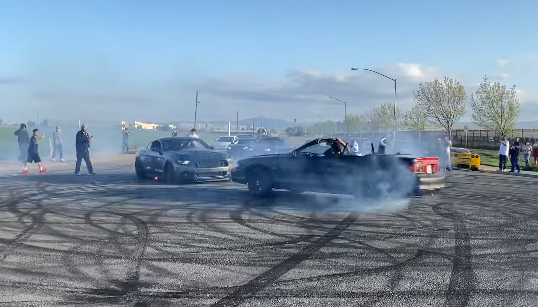 Веселье довольно быстро закончилось – ведь “крутить пончики” на узком участке асфальта решили сразу два Mustang. На видео удалось зафиксировать момент, когда к Ford Mustang 2015 решил присоединиться водитель Mustang SN95. Далее обошлось без сюрпризов – автомобили врезались друг в друга. Это произошло на 8:30 минуте ролика.