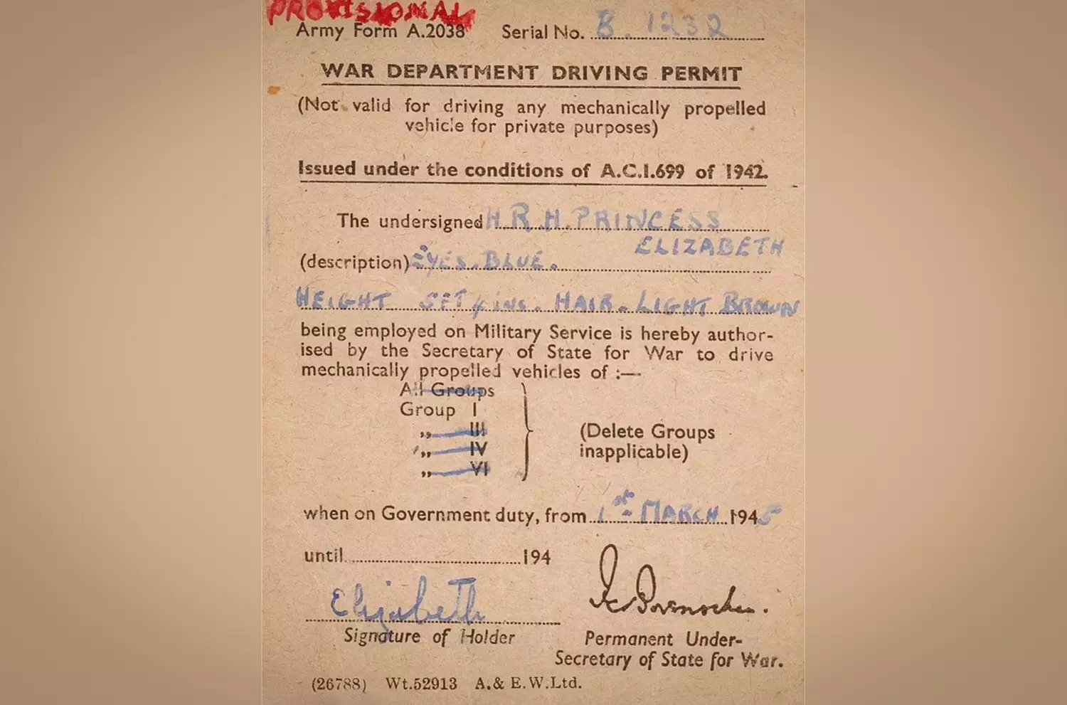 Британский аукционный дом Reeman Dansie выставил на продажу временное водительское удостоверение Ее Величества королевы Елизаветы II, выданное ей королевским военным министерством для работы во Вспомогательной территориальной службе (ATS). Также среди лотов черно-белые фотографии королевской семьи во время работы принцессы механиком и розовая нижняя сорочка с кружевом ручной работы и королевским вензелем.