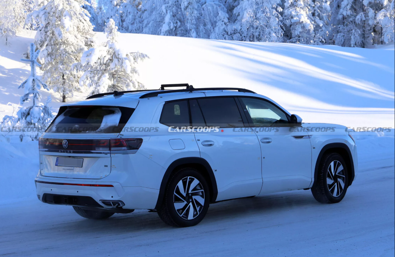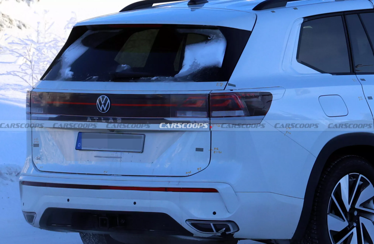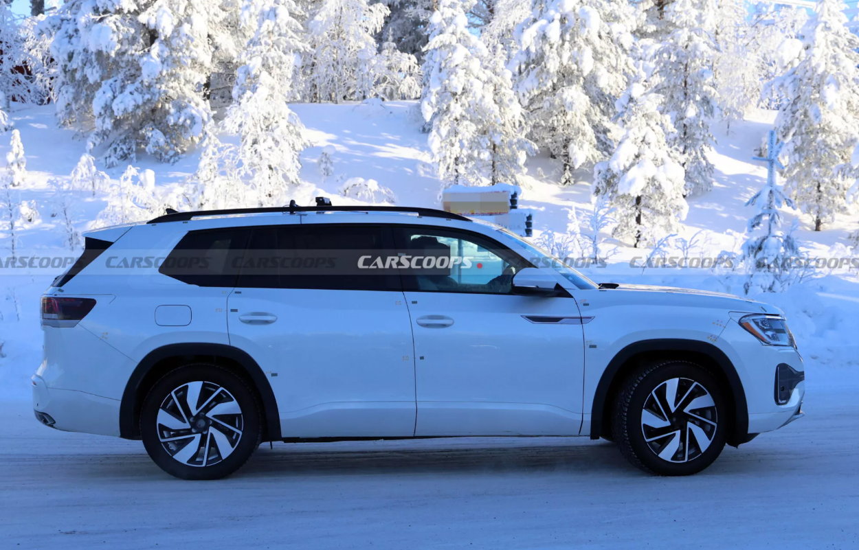 Профиль кроссовера отличается плавными изгибами и массивной облицовкой, выполненной в цвет кузова. Увеличилась площадь остекления, а также изменилась форма дверных ручек. Модернизация затронула и корму Atlas. Судить о задних фонарях сложно, так как они замаскированы под актуальную модель, а вот бампер стал выразительнее. В него интегрирована секция со световой полосой и есть трапециевидный элемент, окружающий фаркоп.