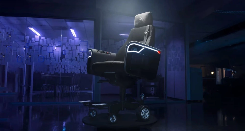 Volkswagen заботится не только о комфорте своих автомобилей. Специалисты концерна разработали офисное кресло с элекроприводом, светодиодной оптикой и клаксоном. Последний, по всей вероятности, нужен для избежания столкновений с коллегами по офису, поскольку кресло может передвигаться с максимальной скоростью 20 км/ч. Также имеются датчики парковки и камера заднего вида с динамической разметкой.
