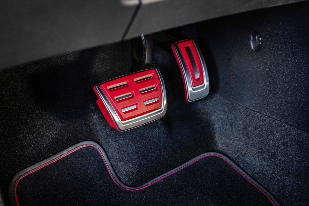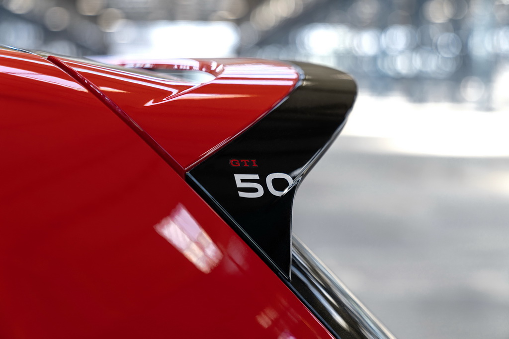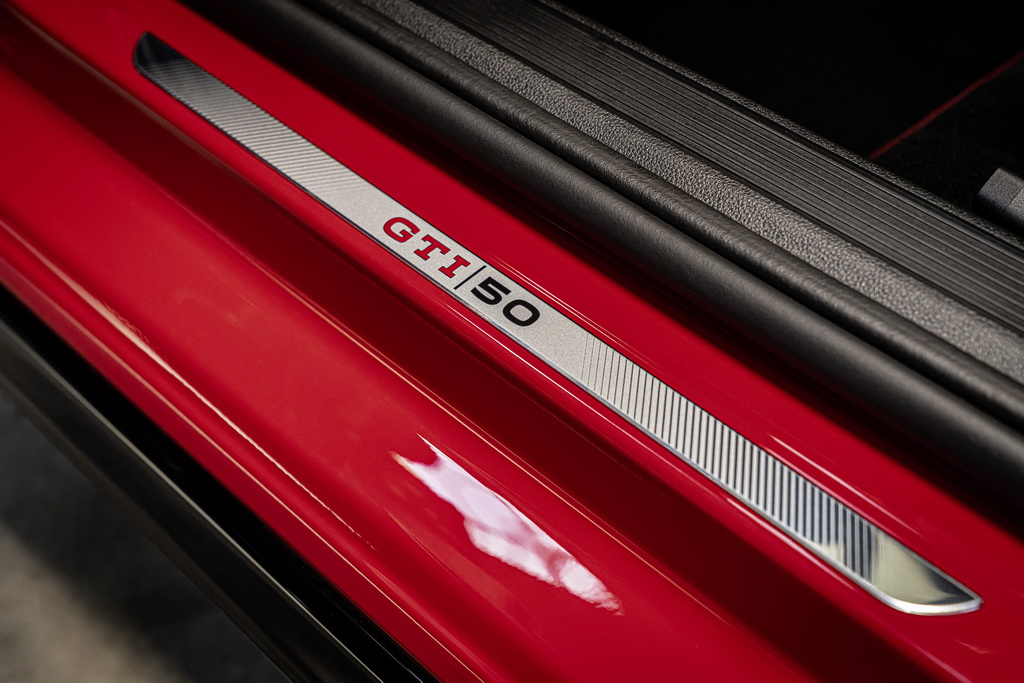 Логотип GTI 50 размещен на спойлере на крыше и внутренней стороне наружных зеркал. Среди других эксклюзивных особенностей – специальная отделка порогов, черная крыша, черные корпуса наружных зеркал и черные насадки на выхлопные трубы. Эффектная полоса на боковинах с градиентом от черного к красному Tornado Red дополнительно подчеркивает спортивный характер автомобиля.