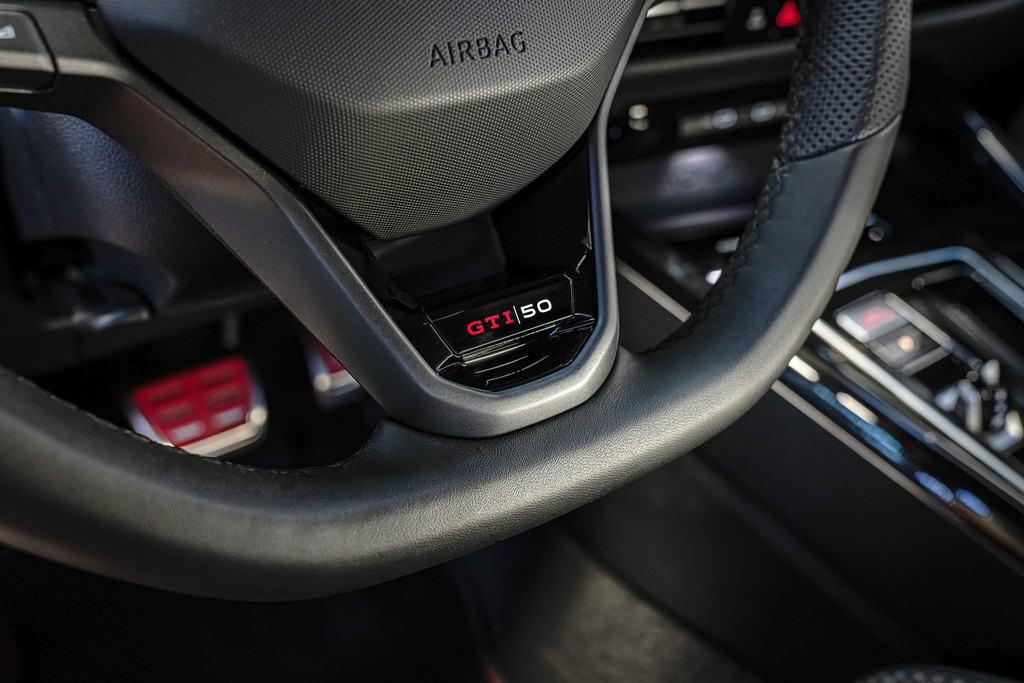 Новинка отличается множеством эксклюзивных дизайнерских решений. Они отражены, например, в спортивных сиденьях с клетчатым рисунком, темно-зелеными деталями и красными ремнями безопасности. Многофункциональное кожаное спортивное рулевое колесо с эмблемой 50 Years GTI и интегрированными подрулевыми переключателями 7-ступенчатой коробки передач DSG также передает гоночный дух модели.