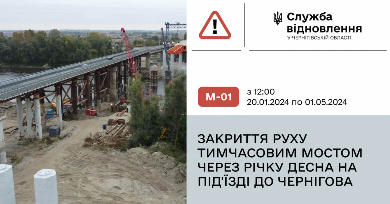 В Черниговской области, недалеко от областного центра закроют временный мост через речку Десна. Как сообщила Служба восстановления и развития инфраструктуры в Черниговской области, движение транспорта по мосту закроют в субботу 20 января с 12:00.