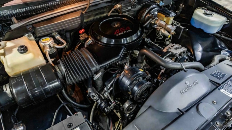 Следы использования видны только на грузовой платформе, в которой время от времени перевозили грузы. И то делали это максимально аккуратно. Подкапотное пространство тоже идеально. 7,4-литровый двигатель V8 мощностью 230 л.с., который сопряжен с четырехступенчатой автоматической коробкой передач, также работает без нареканий. Все благодаря тому, что Chevy 454SS регулярно проходил обслуживание и хранился в сухом отапливаемом гараже.