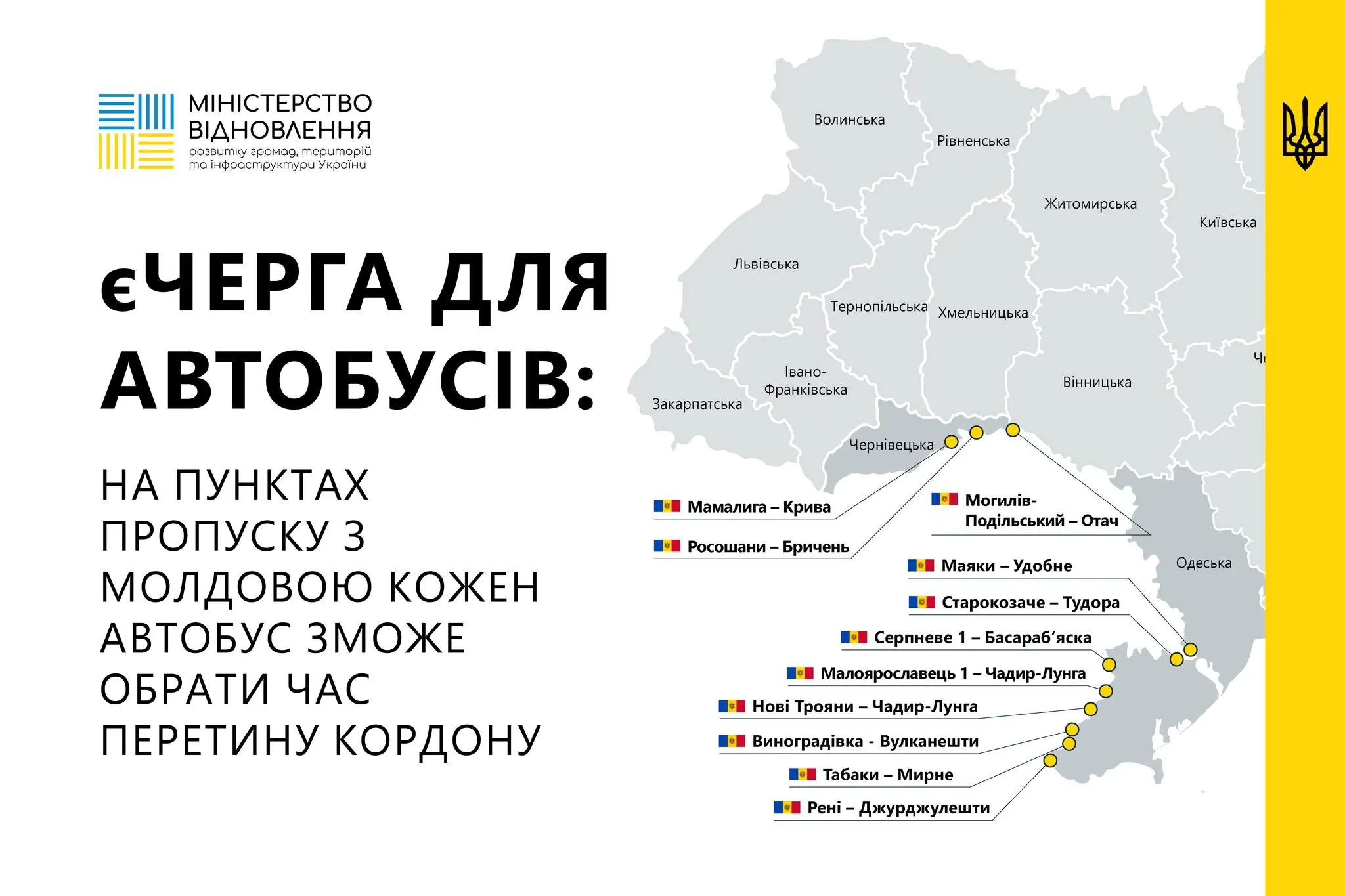 Министерство восстановления Украины анонсировало запуск услуги «єЧерга» на десяти пропускнух пунктах с Молдовой. Она называется «По рассписанию» и предназначена для пассажирских автобусов. Запись в очередь стартовала 24 апреля в 12:00, движение автобусов по записи — 25 апреля с 12:00.