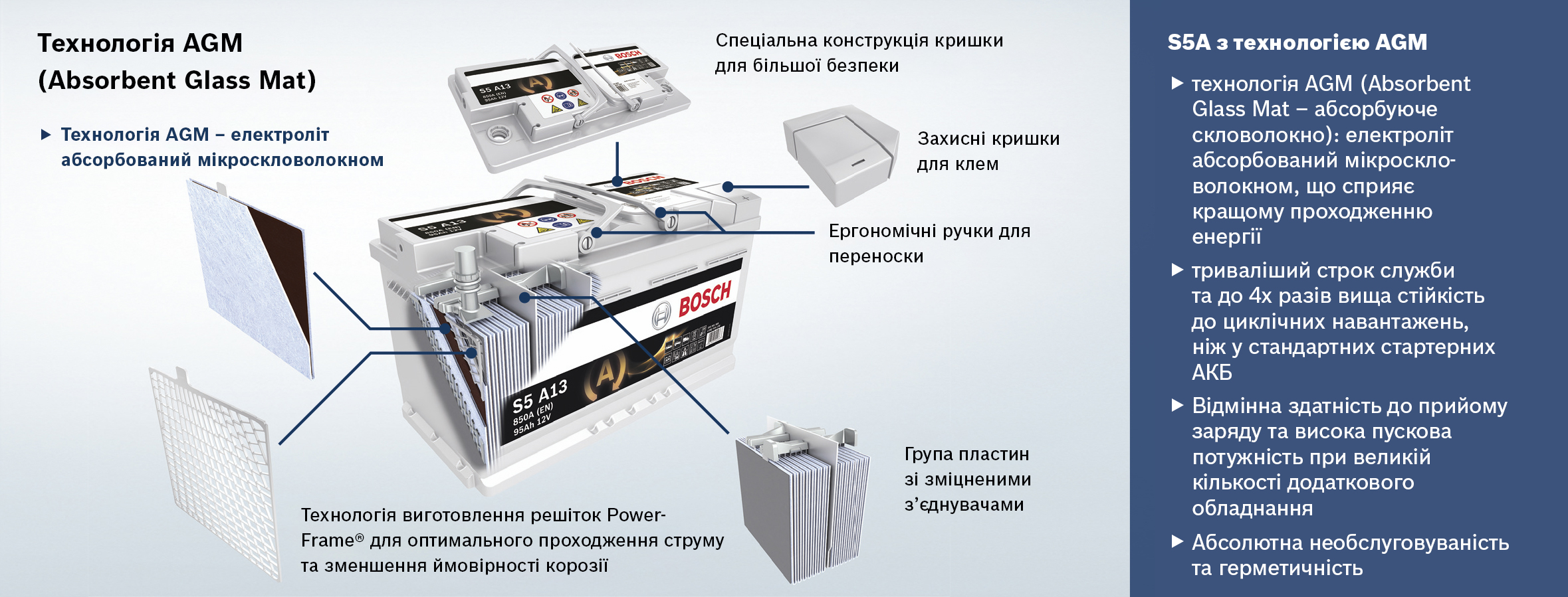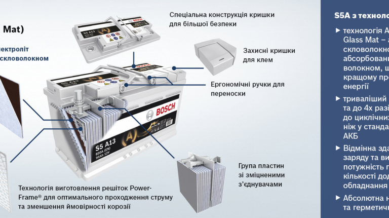 В своих батареях S5 Bosch предлагает еще более современные решения, при этом батареи S5A с технологией AGM предназначены для особых условий работы в составе электросети с системой «старт-стоп» или системой рекуперации энергии торможения. Аккумуляторы с этой технологией обеспечивают уверенный запуск двигателя даже в сильные холода.