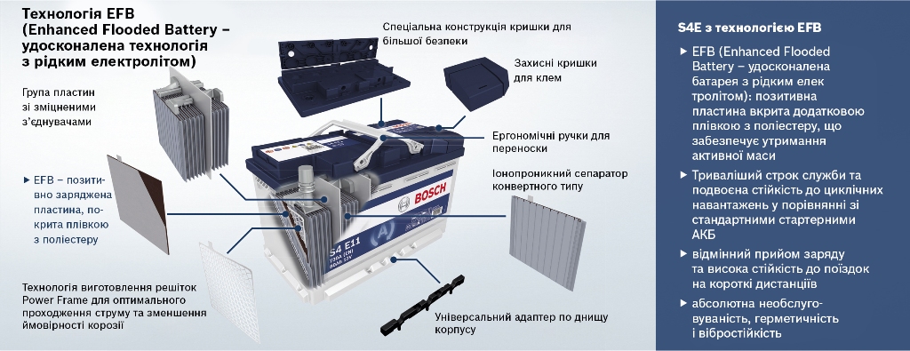 Аккумуляторы линейки S4 предназначены для автомобилей с высоким уровнем энергопотребления, а батареи S4E с технологией EFB специально разработаны для легковых автомобилей с системой «старт-стоп». Благодаря повышенной стойкости к циклическим нагрузкам они обеспечивают уверенный пуск двигателя даже при остановке, когда аккумулятор одновременно питает большое количество электрооборудования.