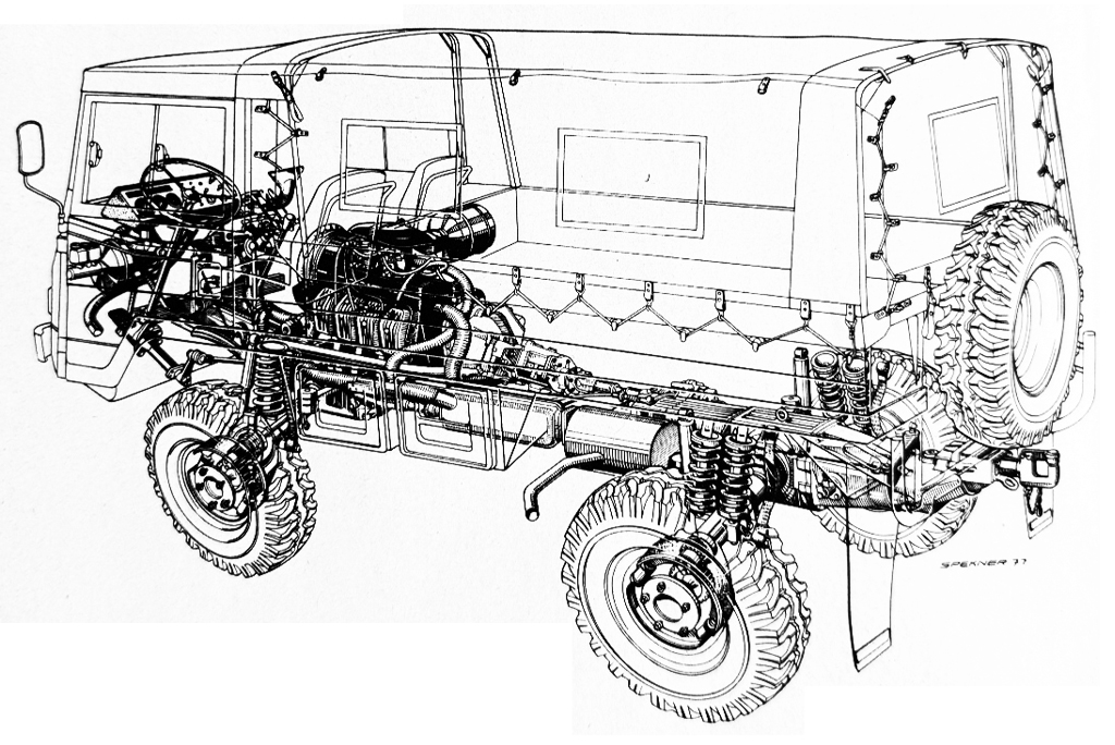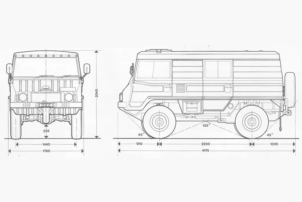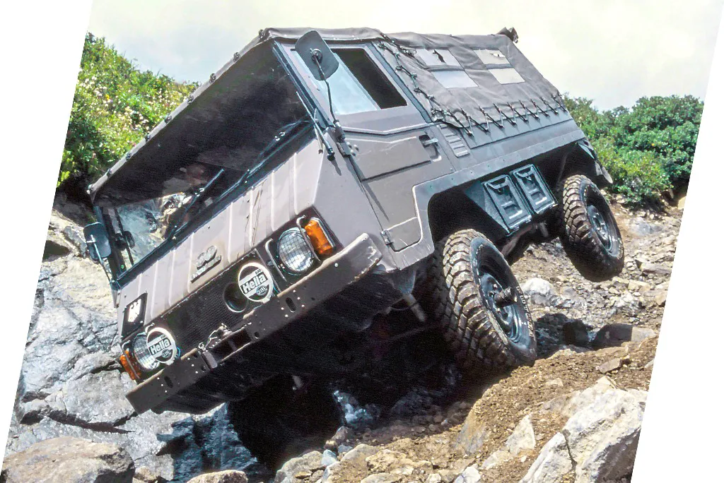 Модель 710М – это ранняя версия автомобиля. Она может перевозить до 10 человек, имеет внушительный клиренс и брезентовый верх. Такие машины компания Steyr-Puch выпускала с 1971 года до середины 80-х. Вездеход оснащен 4-цилиндровым 2,5-литровым бензиновым мотором с воздушным охлаждением собственной разработки, который имел мощность 84-90 л.с. в зависимости от версии.