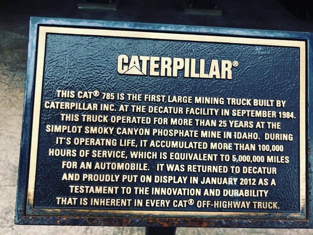 Этот Сaterpillar 685-й модели является первым большегрузным карьерным самосвалом марки. Данный экземпляр был увековечен на постаменте на заводе в Декатуре (штат Джоржия).