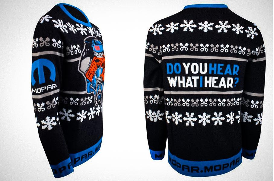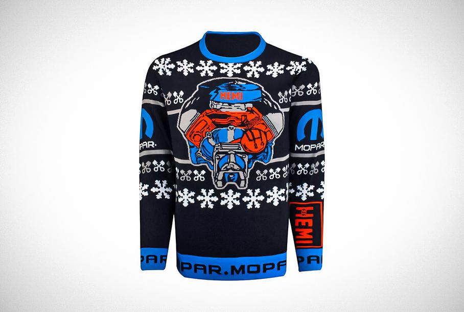 Но самый примечательный элемент коллекции – традиционный американский рождественский свитер, который принято иронично называть уродливым из-за его устаревшего дизайна со снежинками, елками и оленями. Но в конкретном случае помимо снежинок его украшает изображение легендарного двигателя HEMI V8 426 Elephant, разработанного для гонок NASCAR.