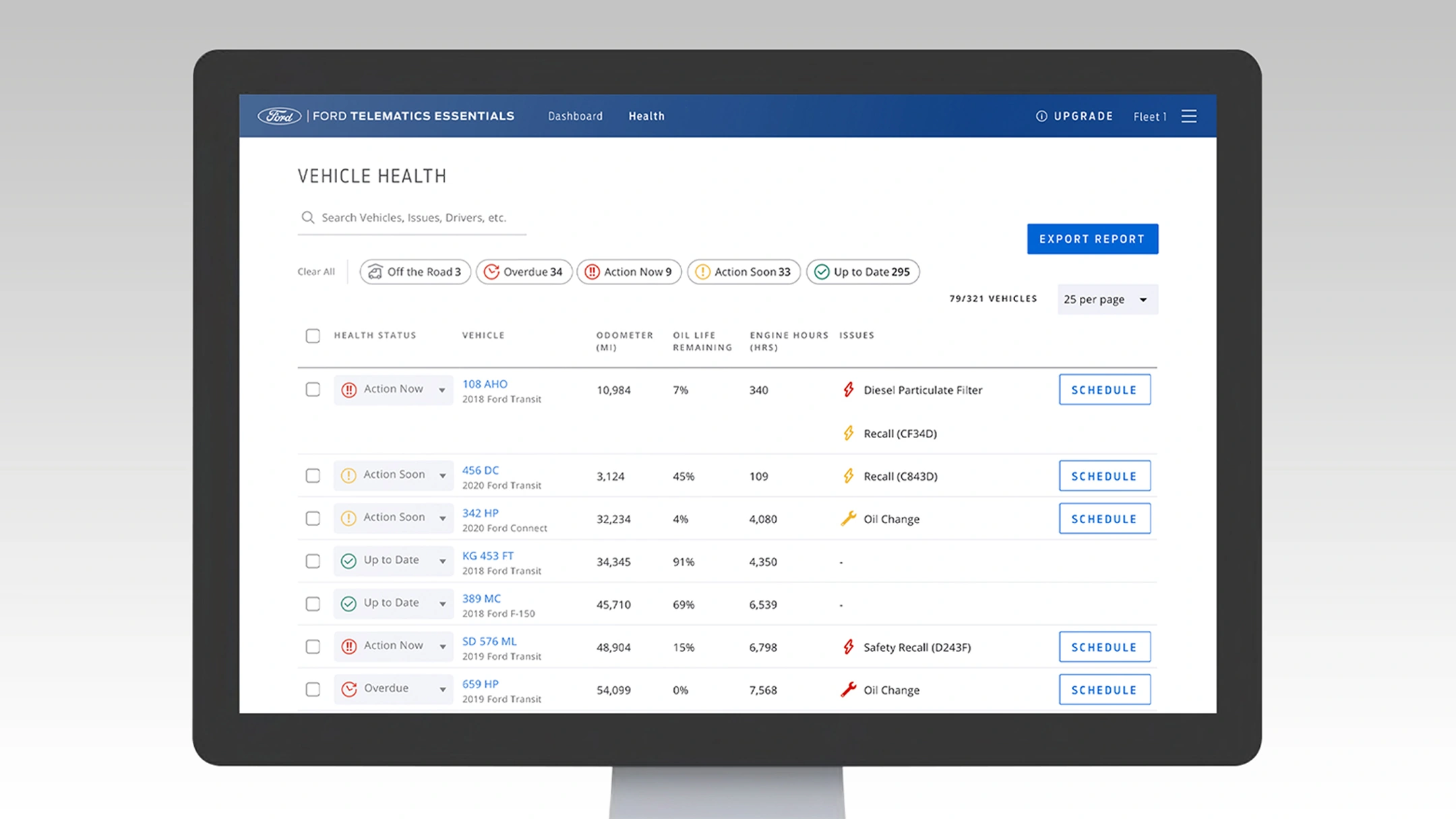 Ford Telematics Essentials лежит в основе системы FORDLiive для пользователей автопарков, предоставляя оповещения о техническом обслуживании на основе данных о состоянии автомобиля в режиме реального времени. Эти оповещения помогают предприятиям увеличить время безотказной работы за счет сокращения количества поломок и сокращения времени обслуживания и ремонта.