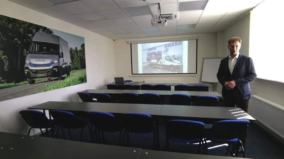 На втором этаже здания расположен отдел продажи новой, а также подержанной техники – у IVECO есть отдельное направление по реализации бывших в употреблении транспортных средств Ok Trucks. Есть также специальный учебный класс для проведения тренингов.