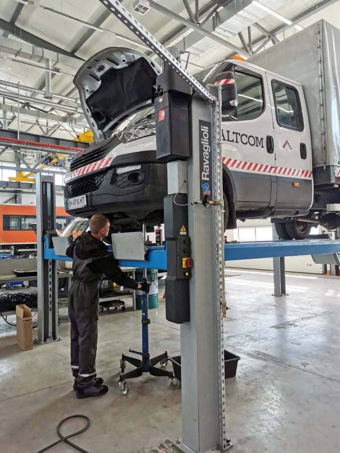 Что же касается сервисной зоны, то здесь находятся пять сервисных линий и два сервисных поста для продолжительного ремонта (агрегатный ремонт). Из всех пяти линий три оборудованы ямами, каждая из которых оснащена ямными домкратами. Одна из линий имеет лифт грузоподъемностью 6,5 т, рассчитанный именно на обслуживание автомобилей IVECO Daily.