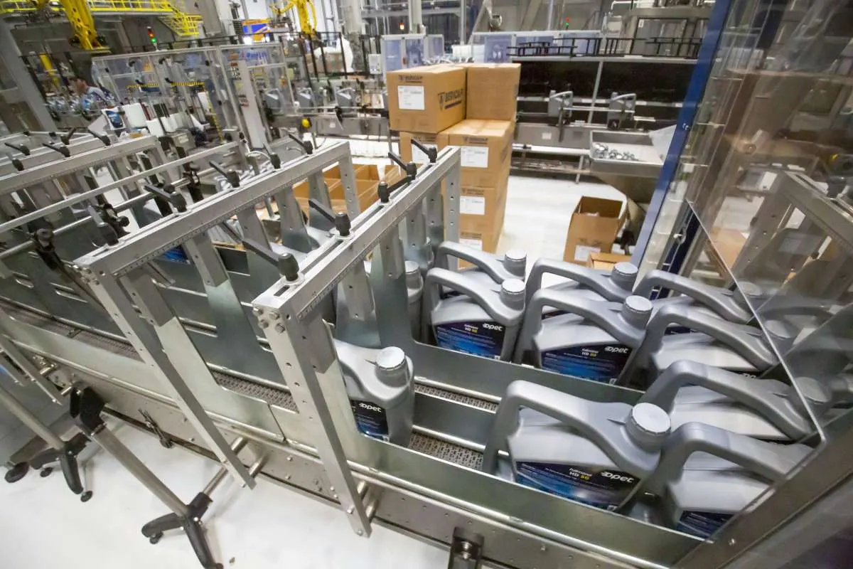 По существу производственный цех представляет собой набор небольших цехов, каждый из которых заточен под тот или иной процесс. Первым делом сырье, хранящееся в отдельных емкостях (40 резервуарах суммарным объемом около 4000 кубических метров), по трубам поступает в цех блэндинга, то есть смешивания (в котором находится 26 емкостей смешивания объемом от 40 до 1 кубического метра). Перед началом производства оператор цеха получает заказc рецептурой приготовления масла. Далее на центральном компьютере, управляющем процессом смешивания, производится подготовка процесса изготовления масла – настраиваются каналы подачи базовых масел и присадок, проверяется работа клапанов, очищаются трубопроводы от остатков старых компонентов. После этого запускаются агрегаты, и автоматика в соответствии с программой отмеряет и подает необходимые порции сырья в блэндер, соблюдая температуру и контролируя давление при смешивании и добавлении каждой присадки.