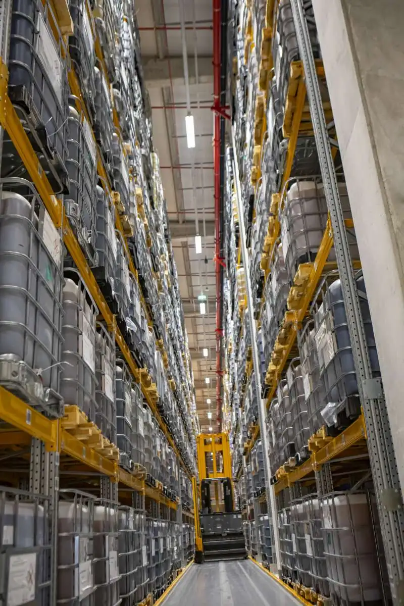 Заключительная часть производства – продукцию помещают на закрытый склад для исключения риска возможного загрязнения масла под действием внешних факторов в виде влаги и пыли. Ресурс склада приличный: это помещение площадью 5600 квадратных метров, где размещаются 9300 паллет для хранения. Тут масла хранятся до этапа отгрузки. В день с завода грузовики вывозят порядка 130 тонн масел.