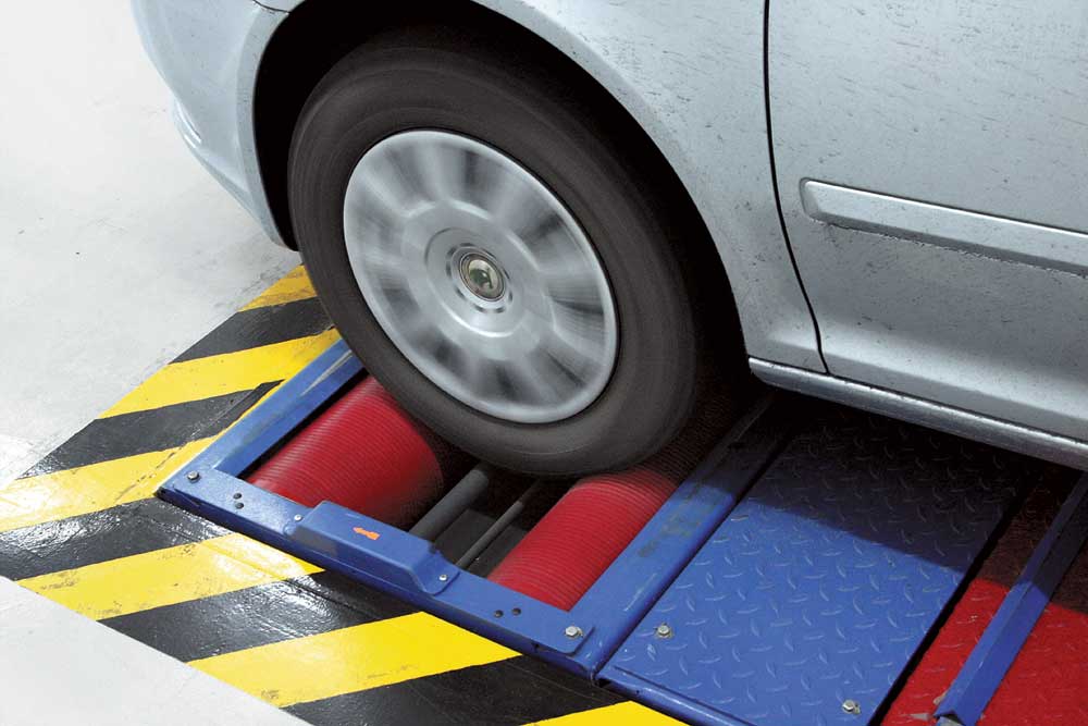 Машина заезжает на стенд поочередно колесами передней и задней осей. Колеса раскручиваются парой барабанов с электроприводом до определенной частоты (имитация скорости 7 км/ч, исключающей активацию АБС). Затем жмем на тормоз. Срабатывают тормозные механизмы, и электроника определяет усилие противодействия вращению барабанов (в процентах относительно веса машины).