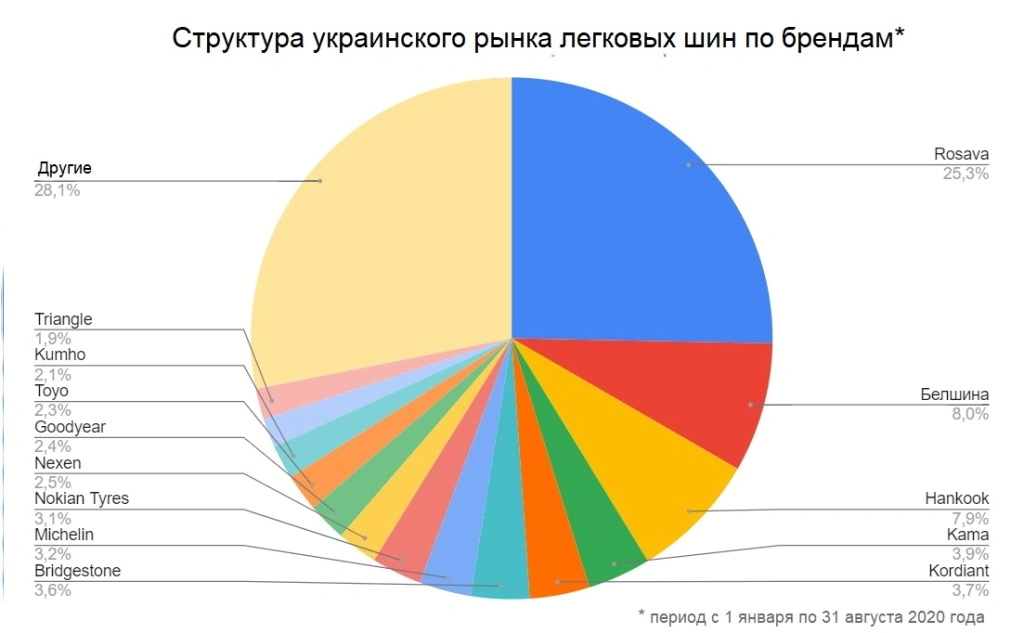 Несмотря на карантин, машин на дорогах не стало меньше, а значит и рынок автомобильных шин продолжает активно жить. Но больше всего он оживает сейчас - осенью, так как уже, пожалуй, 95% автовладельцев понимают, зимние шины в сезон снега и льда должны быть даже в случае теплой зимы. Но вернемся к статистике!Как показывают данные объема шинного рынка в этом и прошлом году, Covid-19 довольно существенно изменил его. Так если в прошлом году за 8 месяцев с января по август объем шинного рынка в Украине составлял 4 млн. 115 тыс. 500 шин, то в этом году снизился до 3 млн. 818 тыс. 300 шин. Но изменилась ли структура рынка? Как оказалось, изменилась, но не существенно.
