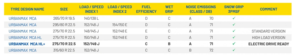 Компания Goodyear выпустила для городских автобусов специальные шины URBANMAX MCA HL+. Используемая в них технология включает в себя новый состав протектора, новый дизайн и конструкцию, которая помогает снизить энергопотребление и уровень шума. Данная модель предназначена для транспорта с 8-тонной осевой нагрузкой, а потому подходит для современных электрических или гибридных автобусов. Модельный ряд URBANMAX MCA создан для круглогодичной эксплуатации и имеет маркировку 3PMSF.