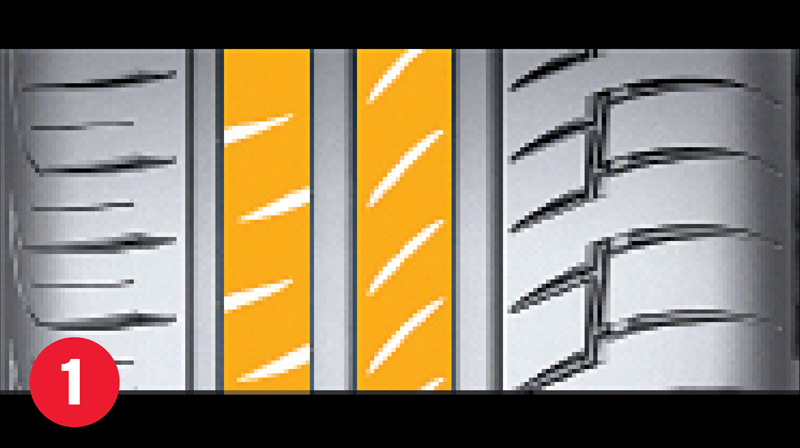 Крупные наружные плечевые блоки ¹ с каналами отвода воды ² и макросвязанной системой ³ обеспечивают эффективную устойчивость в поворотах.